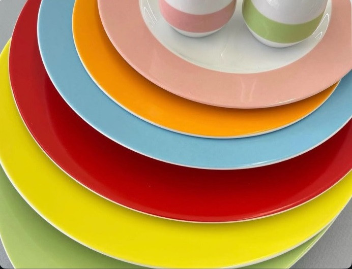 6 بشقاب غذا خوری: قطر 25 سانت (هربشقاب یک رنگ هست: آبی قرمز زرد صورتی سبز و نارنجی)