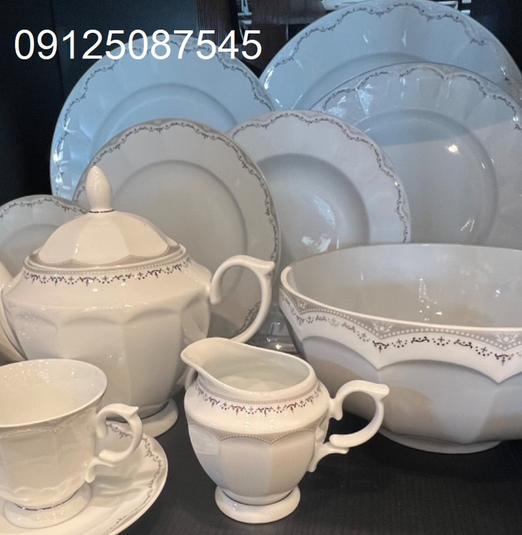 سوپخوری , ظرف سالاد , دیس , بشقاب غذاخوری , بشقاب خورشخوری , پیشدستی , قوری چایخوری , فنجان , نعلبکی , قندان , شکرریز , نمکپاش و فلفلپاش , پیاله , لیوان